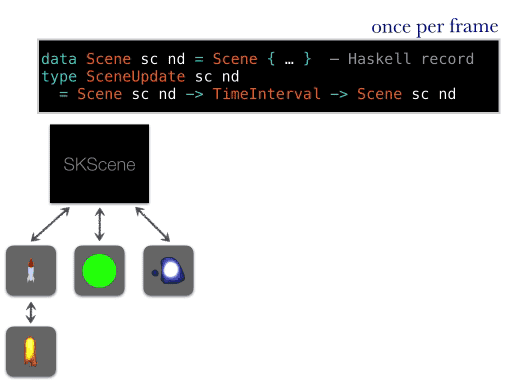 Haskell SpriteKit provides a functional interface without side effects to the object graph used to represent games scenes in SpriteKit. The animation on the right illustrates how Haskell transformation functions (such as SceneUpdate) translate into edits of that object graph. (More information on this library is available in the Haskell SpriteKit repository.)